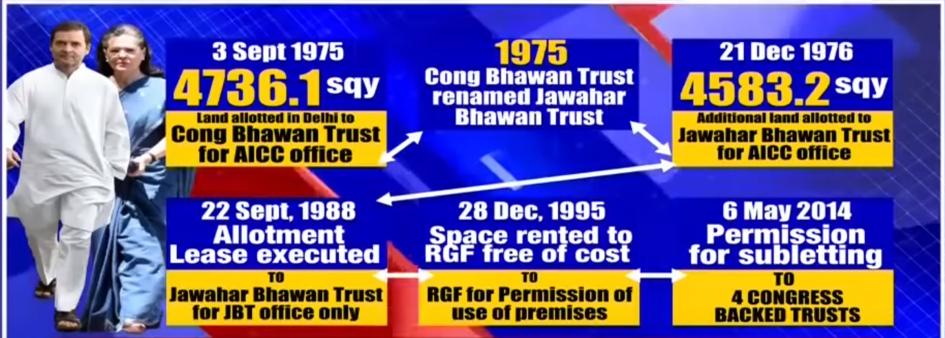 The Times Now report also stated that the rules for the land allotted by the then Indira Gandhi-led government in 1975 for the construction of the Congress party headquarters was eventually violated and altered for the benefit of the Gandhi family and the trusts managed by them. The Congress party, however, did not construct the headquarters at the two-acres land but changed the land allotment rules to lease government lands for free to Gandhis.
