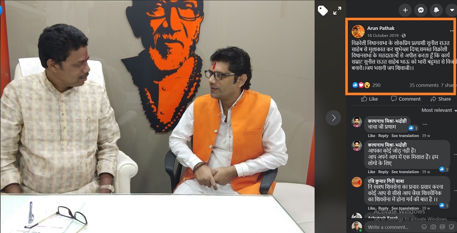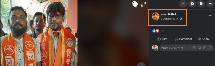 In the below image, he can be seen sitting next to Shiv Sena MLA Sunil Raut. The graffiti of former Shiv Sena leader Balasaheb Thackeray is also visible in the post, which was posted by Arun Pathak on October 18, 2019, a few days before Maharashtra legislative elections.