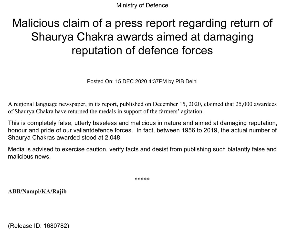 Ministry of Defence has released a press note in which they said that the report published in a Telugu newspaper named Prajashakti on December 15, 2020, was false. They said, “This is completely false, utterly baseless and malicious in nature and aimed at damaging reputation, honour and pride of our valiant defence forces. In fact, between 1956 to 2019, the actual number of Shaurya Chakras awarded stood at 2,048.” MoD further cautioned the media to verify facts and desist from publishing such blatantly false and malicious news.