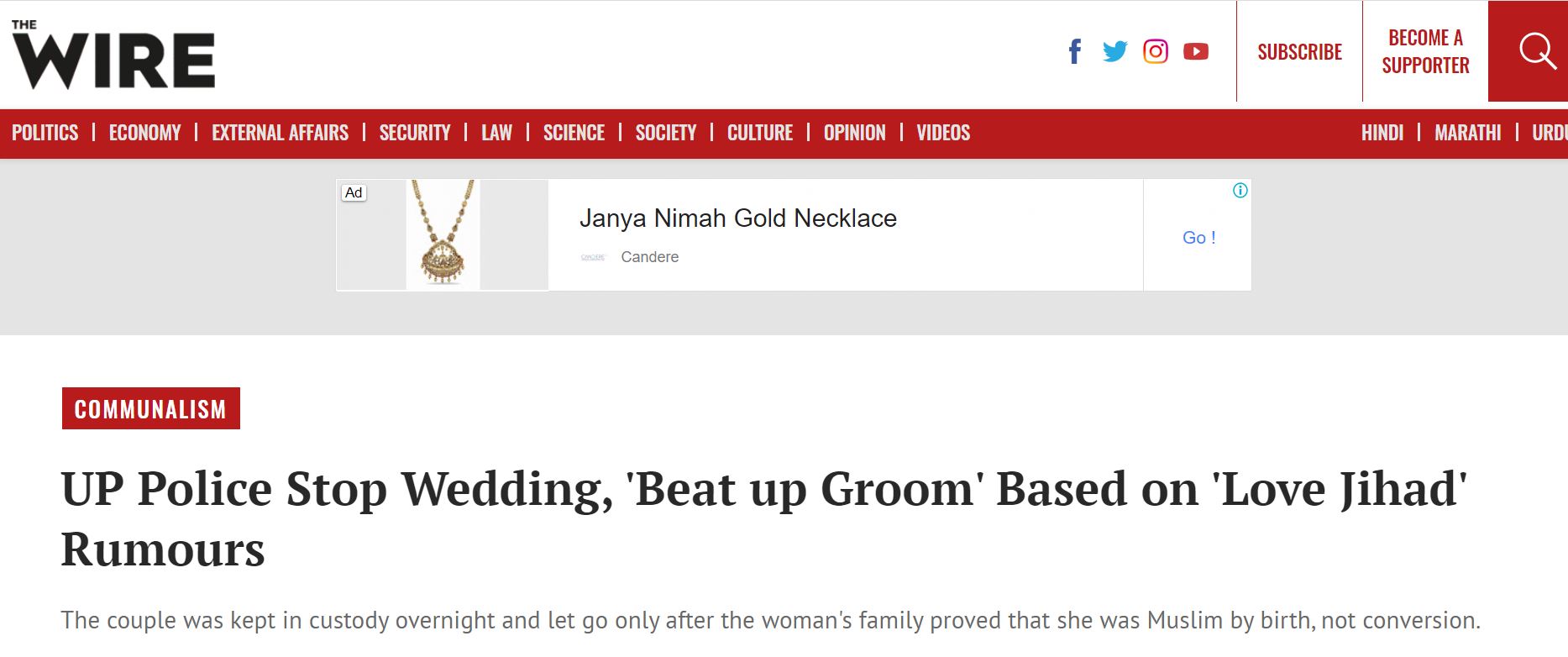 This report was also carried by many other mainstream media outlets. The ultra-leftist news portal The Wire went a step ahead to claim that the Uttar Pradesh police were misusing the “controversial new anti-conversion law”. The Wire also quoted The Indian Express to claim that “Kasya Police Station SHO Sanjay Kumar told Indian Express that “miscreants” were to blame, and that the couple was let go after the police realised they were from the same religion”.