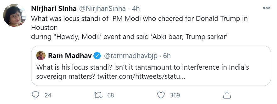 After Canadian Prime Minister Justin Trudeau had made unwarranted comments on the ongoing farmers’ protests inviting sharp criticism in India, Nirjhari Sinha had taken to Twitter to bat on behalf of Canada and had gone on to ask what locus-standi did PM Modi have to cheer “Abki baar, Trump Sarkar” in Houston.