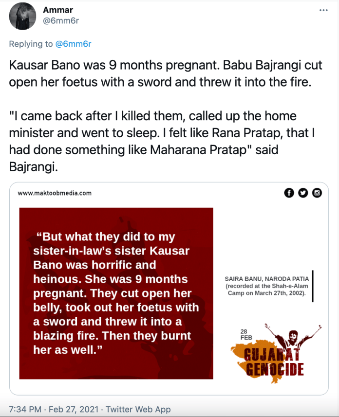 On February 27, 2002 59 Hindu pilgrims, returning from Ayodhya were burnt alive after a Muslim mob set the train on fire. Subsequently, communal riots gripped Gujarat. Multiple media outlets at that time had ran a story that a pregnant Muslim woman was raped by a Hindu mob, her pregnant belly slit open and her foetus flung into fire. Some versions also included that the above act was done with a sword.