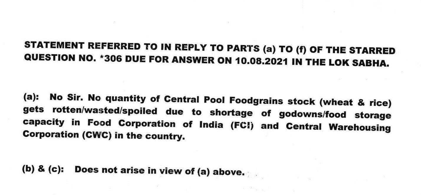However, the question posed by the two BJP MPs was not on the total wastage of food grains in the FCI godowns but regarding the wastage due to shortage of godowns or storage capacity. In response, the Modi government has provided the public data, which is availed to the Ministry of Consumer Affairs, Food and Public Distribution.