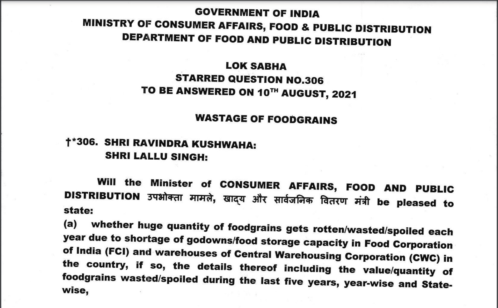 Saket Gokhale posted an image of a questionnaire posed by BJP MPs Ravindra Kushwaha and Lallu Singh to the Ministry of Consumer Affairs, Food and Public Administration to know how much food grains were rotten or wasted each year due to shortage of storage capacity in the warehouses of Food Corporation of India (FCI) and Central Warehousing Corporation (CWC).