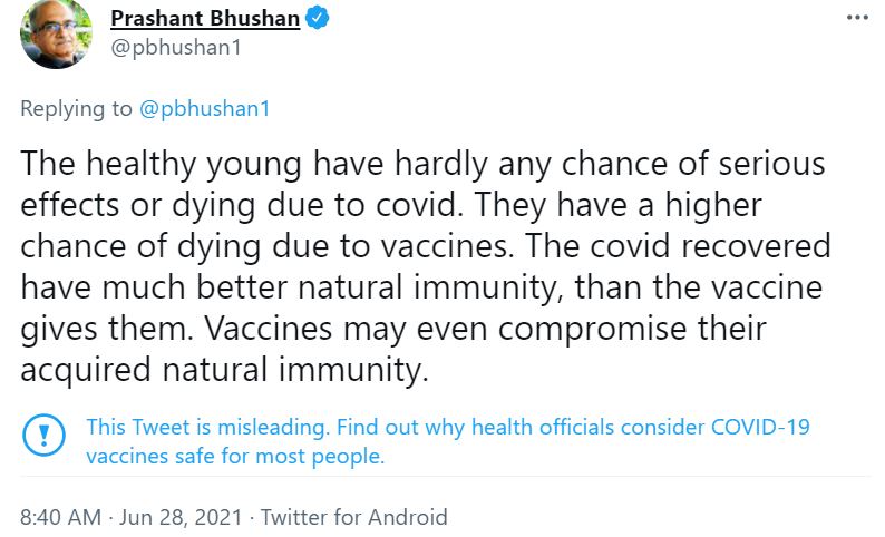 Yet again, Twitter flagged the dangerous anti-vaccine tweets put out Prashant Bhushan.