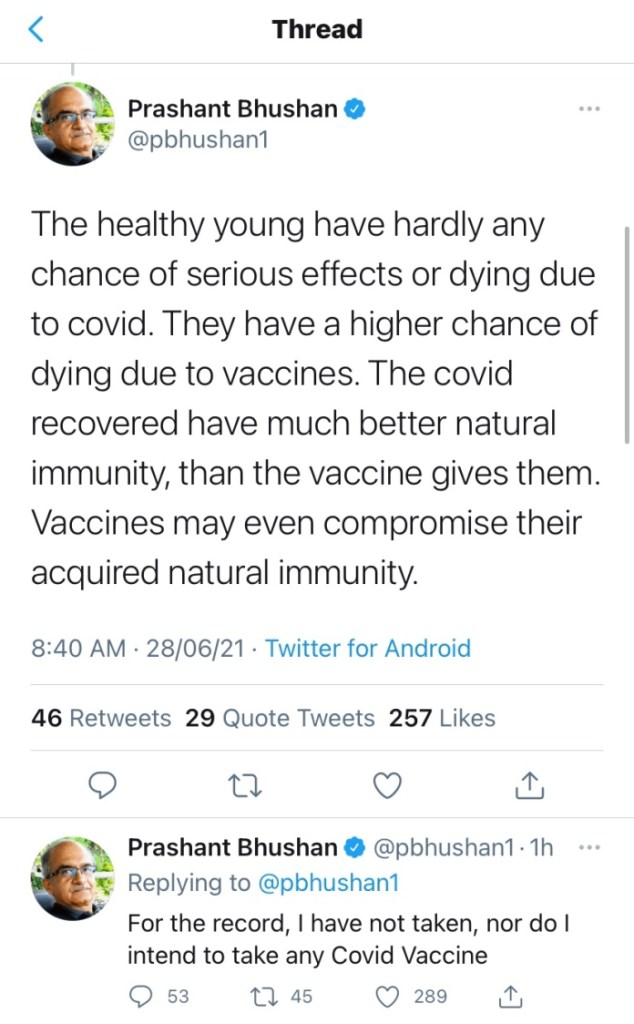 For the last few months, Prashant Bhushan has been pushing anti-vaccine propaganda on Twitter by raising doubts about the efficacy of Indian-made vaccines. His anti-vaccine bile had come after Twitter had removed Prashant Bhushan’s anti-mask tweets for spreading misinformation.